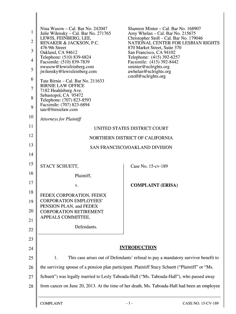 1 2 3 4 5 6 7 8 9 10Nina Was ow Cal. Bar No. 242047 Julie Zelensky Cal. Bar No. 271765 LEWIS, FEINBERG, LEE, RENATER & JACKSON, P.C. 476 9th Street Oakland, CA 94612 Telephone: (510) 8396824 Facsimile: