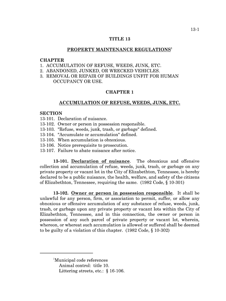 131 TITLE 13 PROPERTY MAINTENANCE REGULATIONS1 CHAPTER 1. ACCUMULATION OF REFUSE, WEEDS, JUNK, ETC. 2. ABANDONED, JUNKED, OR WRECKED VEHICLES. 3. REMOVAL OR REPAIR OF BUILDINGS UNFIT FOR HUMAN OCCUPANCY