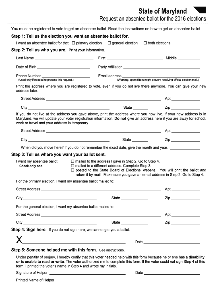 Get the free Absentee ballot application for 2016 elections PDF - montgomerycountymd