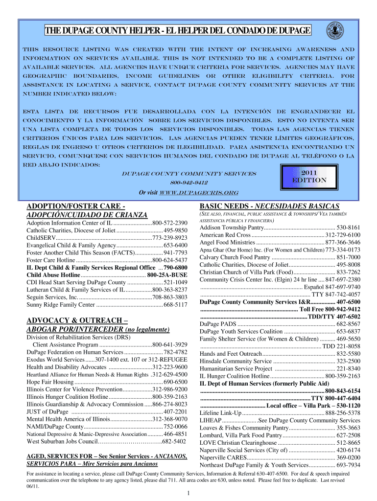THE DUPAGE COUNTY HELPER EL HELPER DEL CONRAD DE DUPAGE THIS RESOURCE LISTING WAS CREATED WITH THE INTENT OF INCREASING AWARENESS AND INFORMATION ON SERVICES AVAILABLE. THIS IS NOT INTENDED TO BE