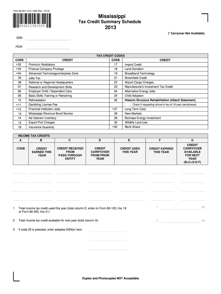 Reset Form 804011381000 (Rev. 12/13) Print Form Mississippi Tax Credit Summary Schedule 804011381000 2013 (* Carryover Not Available) SSN VEIN CODE TAX CREDIT CODES CODE CREDIT 02 Premium Retaliatory