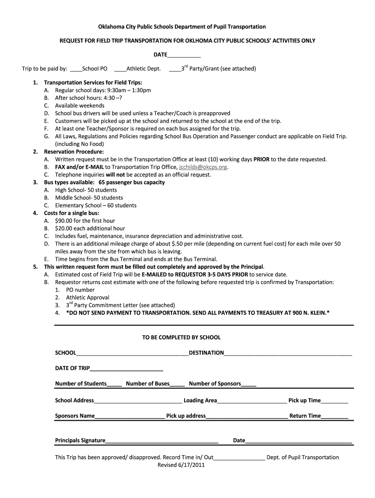 Oklahoma City Public Schools Department of Pupil Transportation REQUEST FOR FIELD TRIP TRANSPORTATION FOR OKLAHOMA CITY PUBLIC SCHOOLS ACTIVITIES ONLY DATE Trip to be paid by: School PO 1. 2. 3. 4.