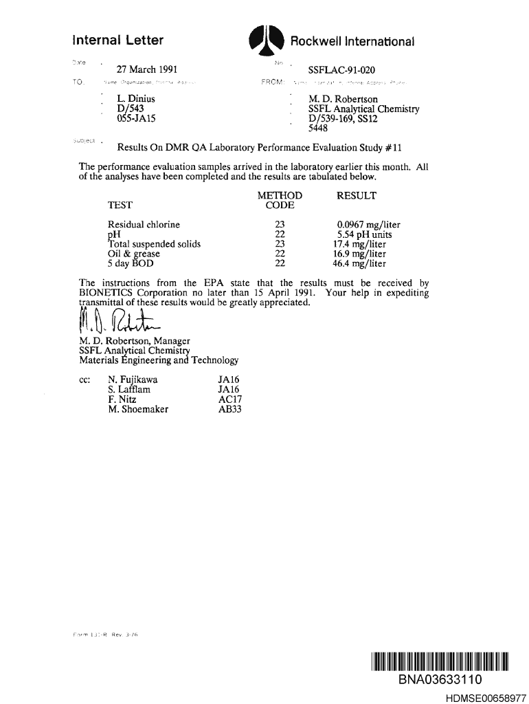 Internal Letter 01% Rockwell International 27 March 199 1 SSFLAC9102 0 For M TO L. Dingus M. D. Robertson D/543 SSL Analytical Chemistry 055JA15 D/539169, SS12 5448 UC etc Results On DMR QA Laboratory