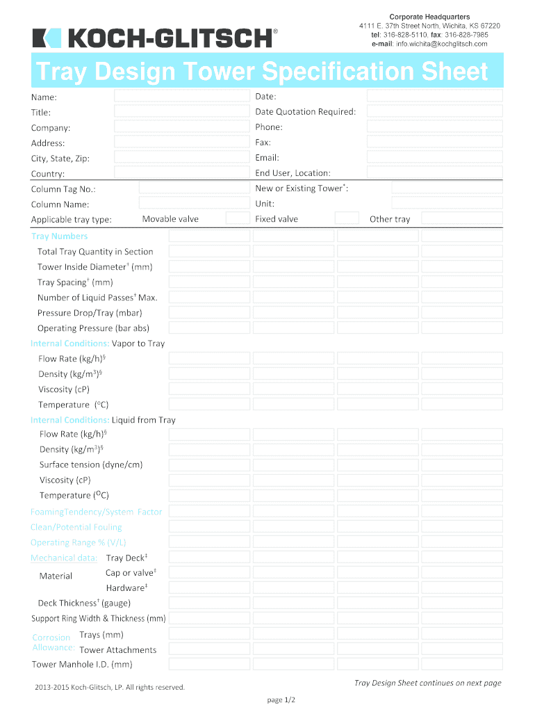 Get the free Tray Design Tower Specification Sheet - Koch-Glitsch