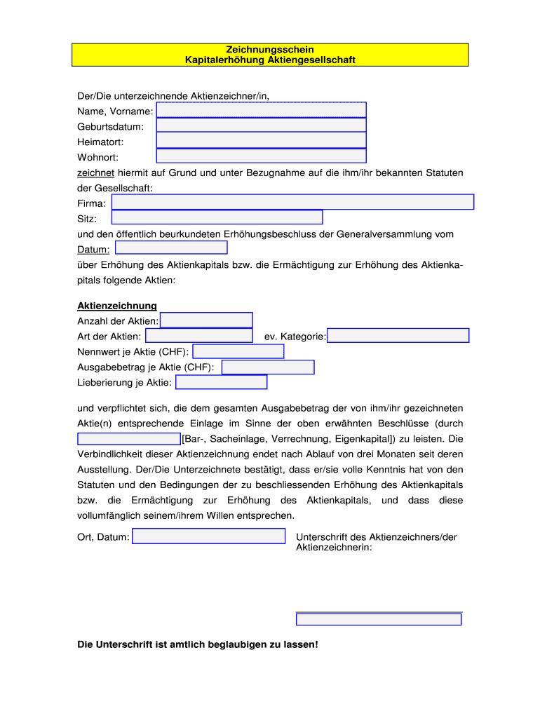Zeichnungsschein Kapitalerhhung Aktiengesellschaft Her/Die unterzeichnende Aktienzeichner/in, Name, Surname: Geburtsdatum: Hampton: Cohort: cachet hermit AUF Ground UND under Bezugnahme AUF die him/ICR