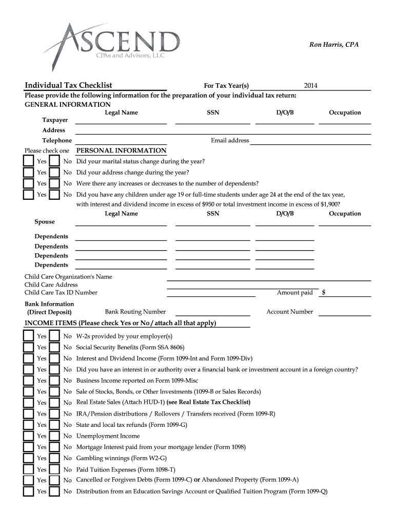 Ron Harris, CPA Individual Tax Checklist For Tax Year(s) Please provide the following information for the preparation of your individual tax return: GENERAL INFORMATION Taxpayer Legal Name SSN 2014