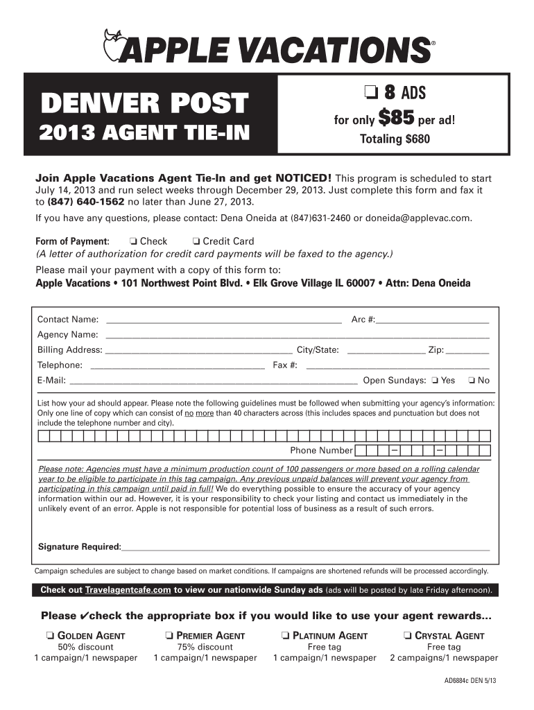 J 8 ADS for only $85 per ad! DENVER POST 2013 AGENT TIEPIN Totaling $680 Join Apple Vacations Agent Tiepin and get NOTICED! This program is scheduled to start July 14, 2013, and run select weeks through