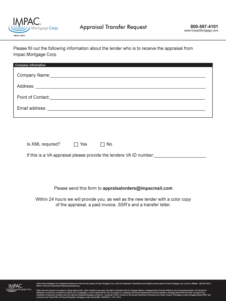 Appraisal Transfer Request 8005974101 www.ImpacMortgage.com Please fill out the following information about the lender who is to receive the appraisal from Impact Mortgage Corp. Company Information