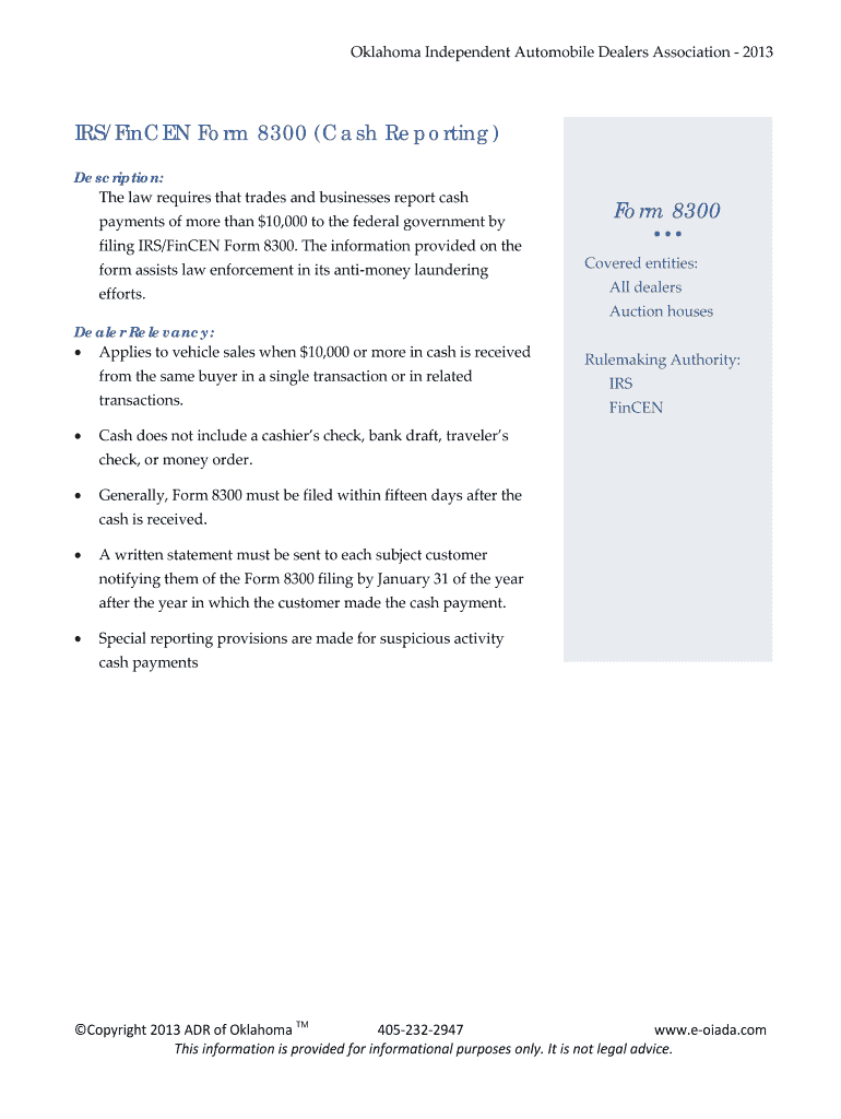 Oklahoma Independent Automobile Dealers Association 2013IRS/Fin CEN Form 8300 (Cash Reporting) Description: The law requires that trades and businesses report cash payments of more than $10,000 to