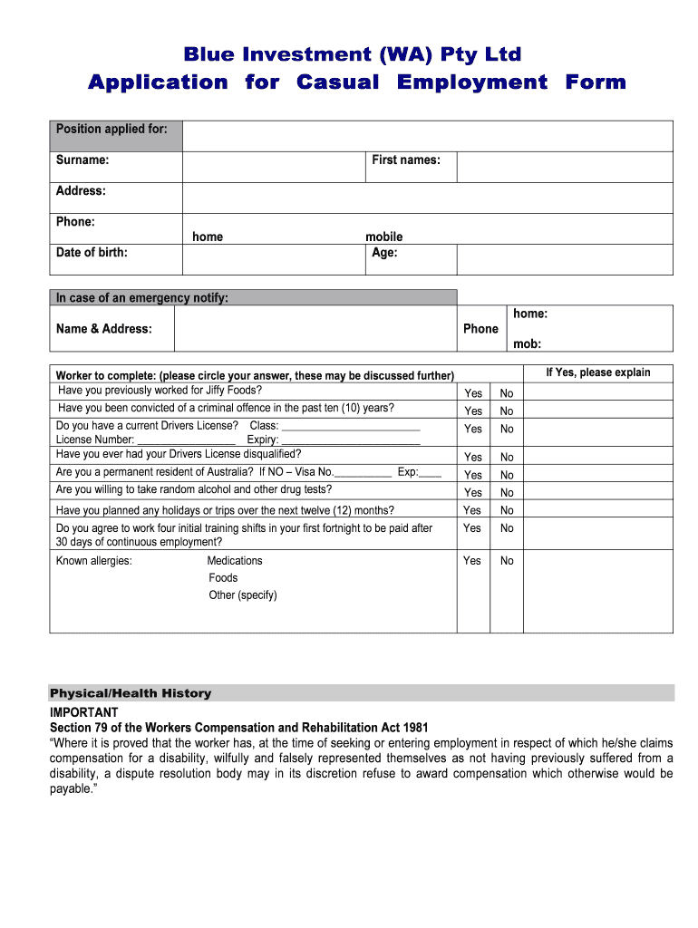 Blue Investment (WA) Pty Ltd Application for Casual Employment Form Position applied for: Surname: First names: Address: Phone: home Date of birth: mobile Age: In case of an emergency notify: home: