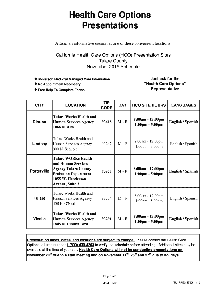Health Care Options Presentations Attend an informative session at one of these convenient locations. California Health Care Options (HBO) Presentation Sites Tulare County November 2015 Schedule Just