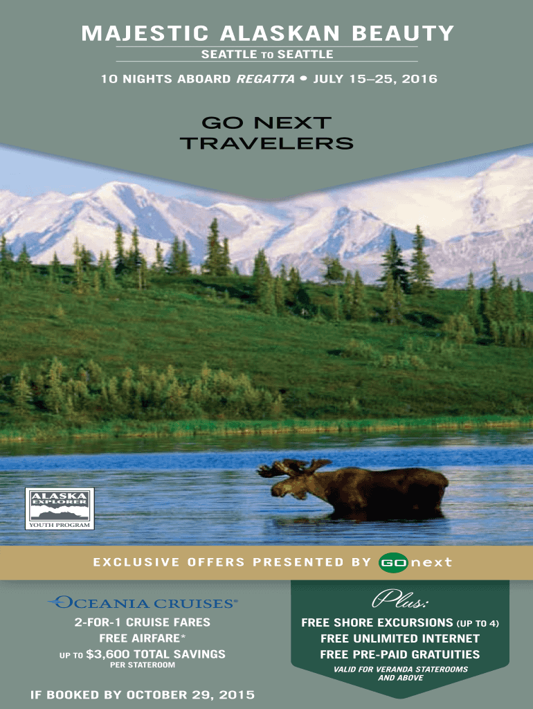 MAJESTIC ALASKAN BEAUTY SEATTLE TO SEATTLE 10 NIGHTS ABOARD REGATTA JULY 1525, 2016 GO NEXT TRAVELERS E C L U S I V E OF FER S P R ES EN TED BY Plus: 2FOR1 CRUISE FARES FREE AIRFARE* UP TO $3,600