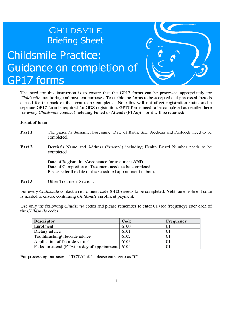 Child smile Briefing Sheet Child smile Practice: Guidance on completion of GP17 forms The need for this instruction is to ensure that the GP17 forms can be processed appropriately for Child smile