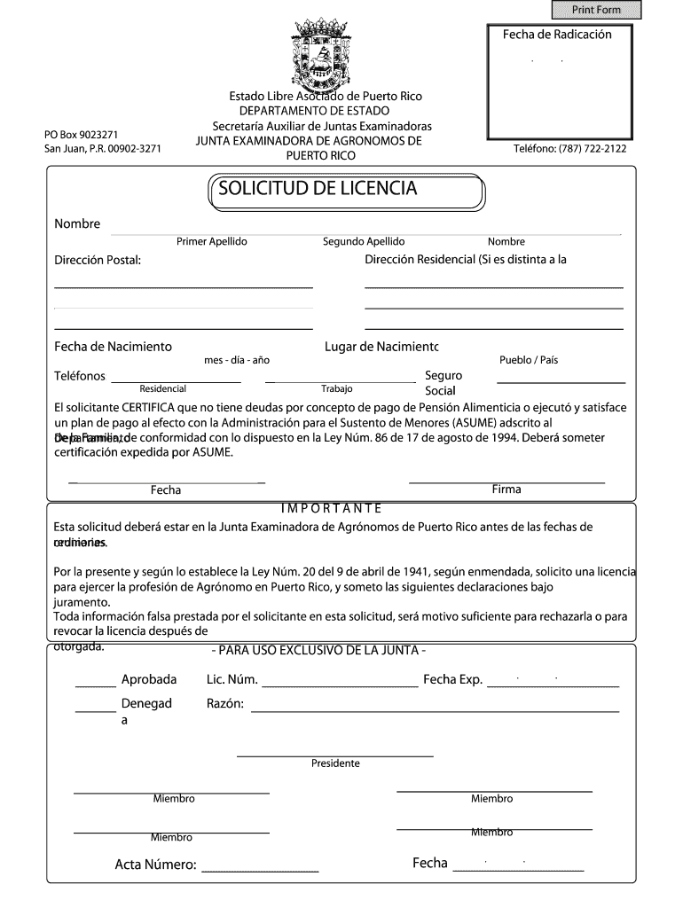 Print Form Tech de Radicacin. Est ado Libra Avocado de Puerto Rico DEPARTMENT DE ESTATE Secretary Auxiliary de Juntas Examinadoras JUNTA EXAMINADORA DE AGRONOMIST DE PUERTO RICO PO Box 9023271 San