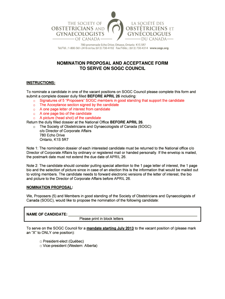 Get the free NOMINATION PROPOSAL AND ACCEPTANCE bFORMb TO bb - SOGC