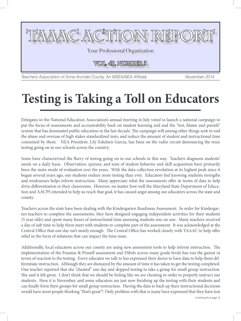 TA AAC ACTION REPORT Your Professional Organization Vol. 47, Number 3 Teachers Association of Anne Arundel County, An SEA/NEA Affiliate November 2014 Testing is Taking a Toll on Educators Delegates