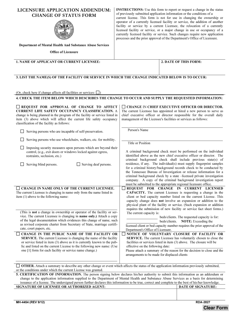LICENSURE APPLICATION ADDENDUM: CHANGE OF STATUS FORM INSTRUCTIONS: Use this form to report or request a change in the status of previously submitted application information or the conditions of a