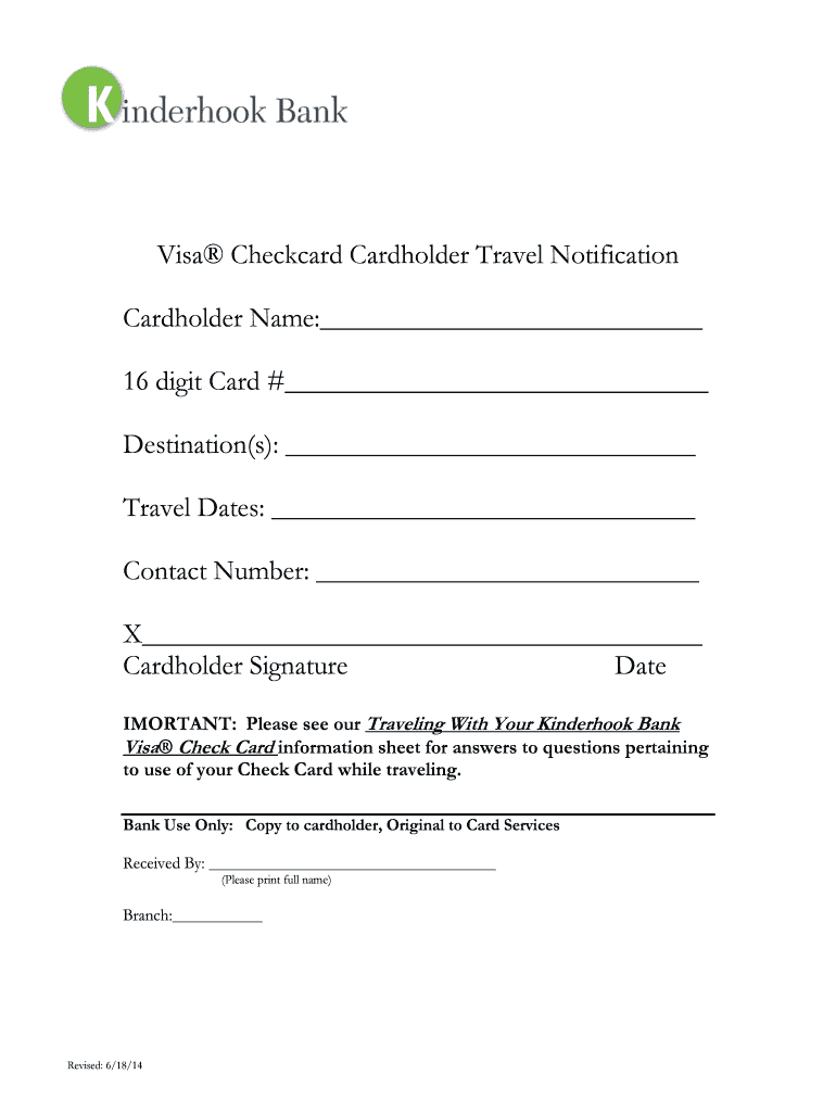 Get the free Visa Checkcard Cardholder Travel Notification - Kinderhook Bank