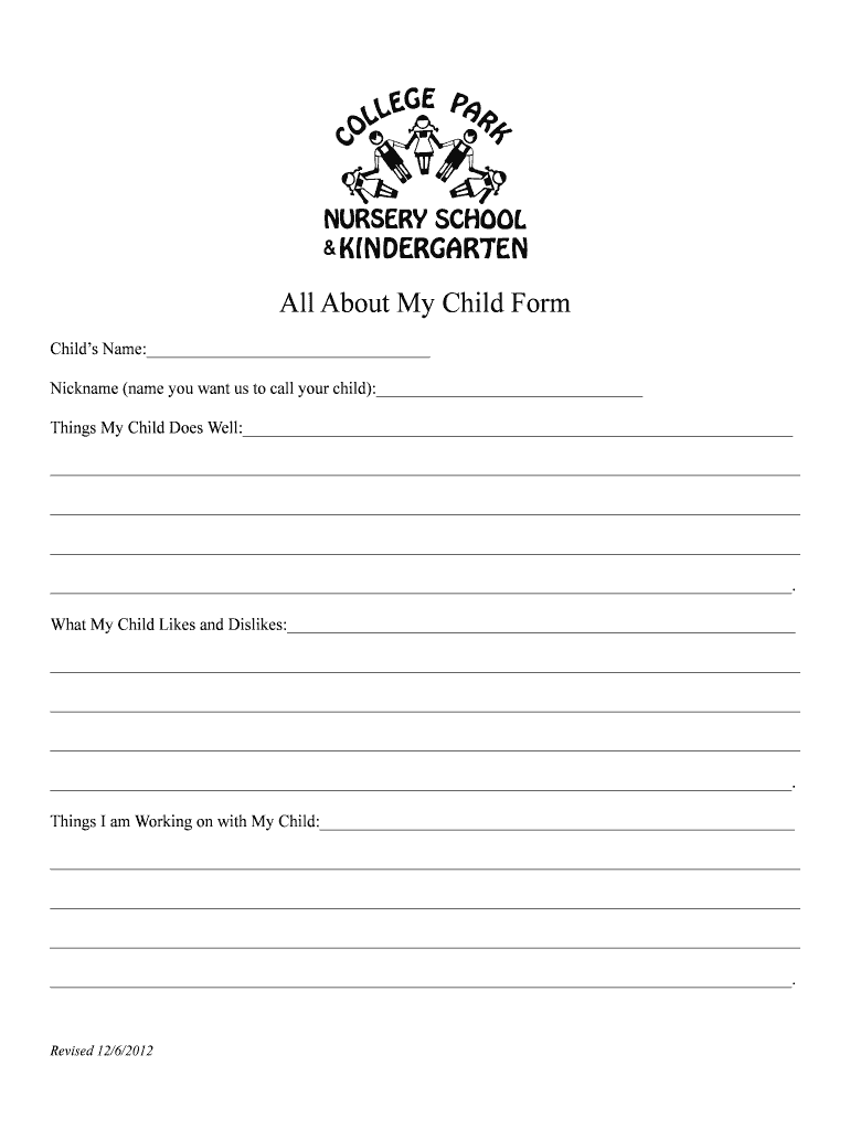 All About My Child Form Child's Name: Nickname (name you want us to call your child): Things My Child Does Well:. What My Child Likes and Dislikes:. Things I am Working on with My Child:. Revised
