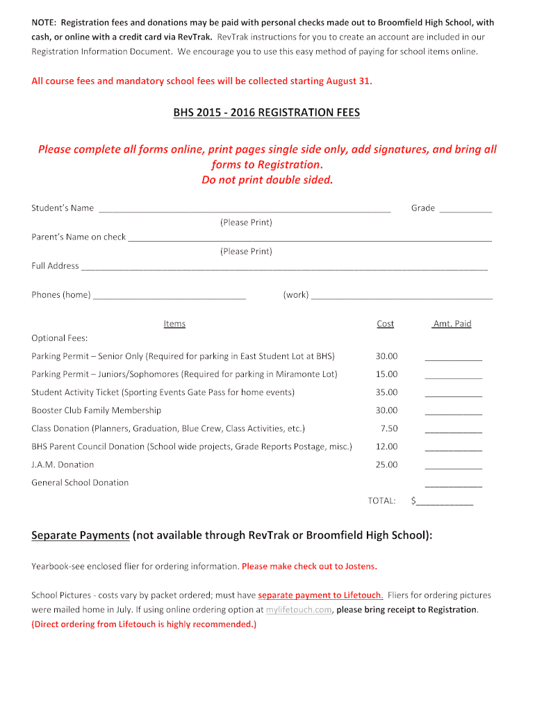 Get the free BHS 2015 - 2016 REGISTRATION FEES - brh bvsd