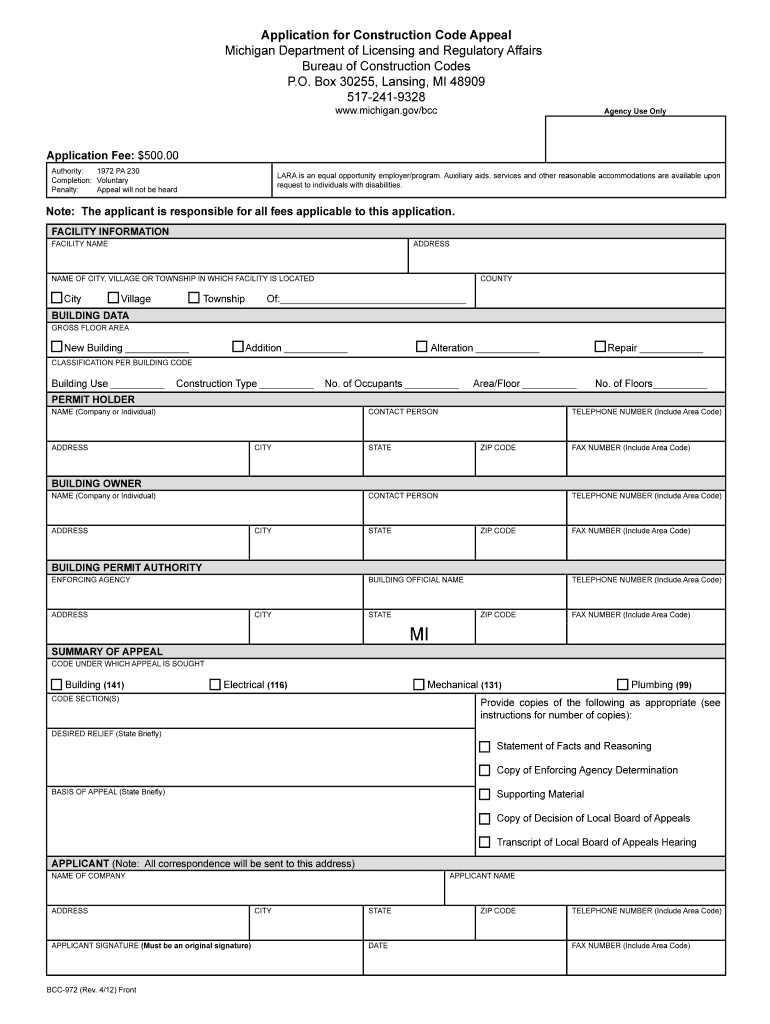 Application for Construction Code Appeal Michigan Department of Licensing and Regulatory Affairs Bureau of Construction Codes P. O. Box 30255 Lansing MI 48909 517-241-9328 Print www. michigan*gov/bcc Clear Agency Use Only This form can be completed by tabbing to each field and typing in the required information* Application Fee 500. 00 Authority 1972 PA 230 Completion Voluntary Penalty Appeal will not be heard LARA is an equal opportunity employer/program* Auxiliary aids services and other...