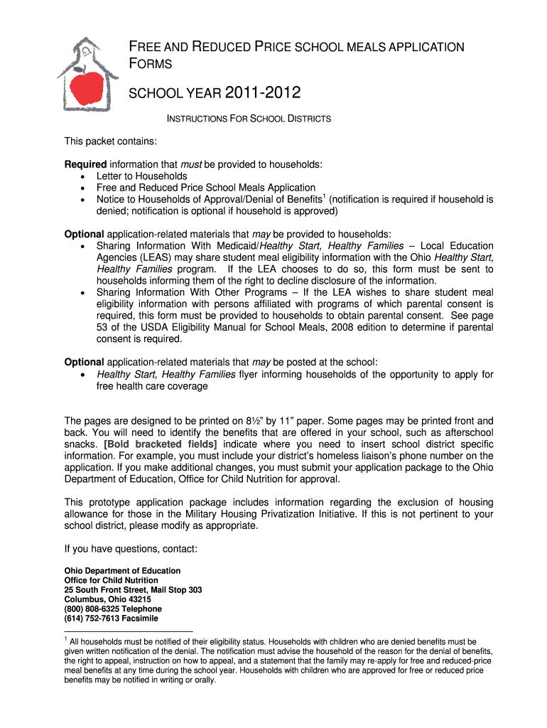 FREE AND REDUCED PRICE SCHOOL MEALS APPLICATION FORMS SCHOOL YEAR 20112012 INSTRUCTIONS FOR SCHOOL DISTRICTS This packet contains: Required information that must be provided to households: Letter