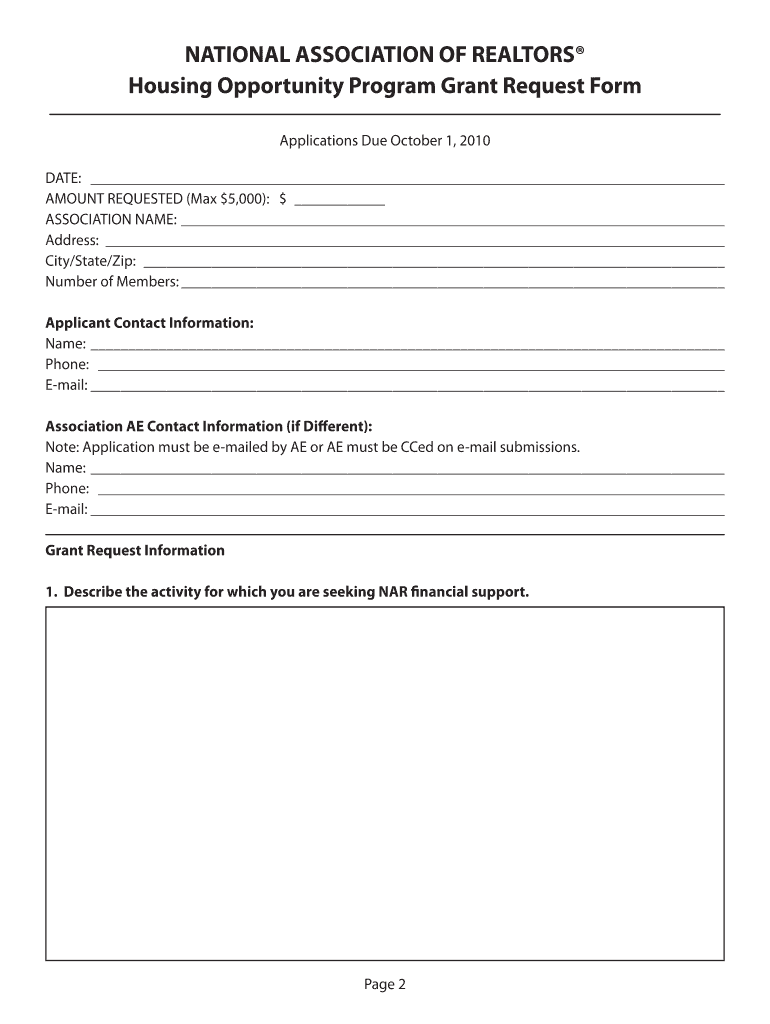 NATIONAL ASSOCIATION OF REALTORS Housing Opportunity Program Grant Request Form Overview: Housing Opportunity Program Grants support the efforts of state and local REALTOR associations who are implementing