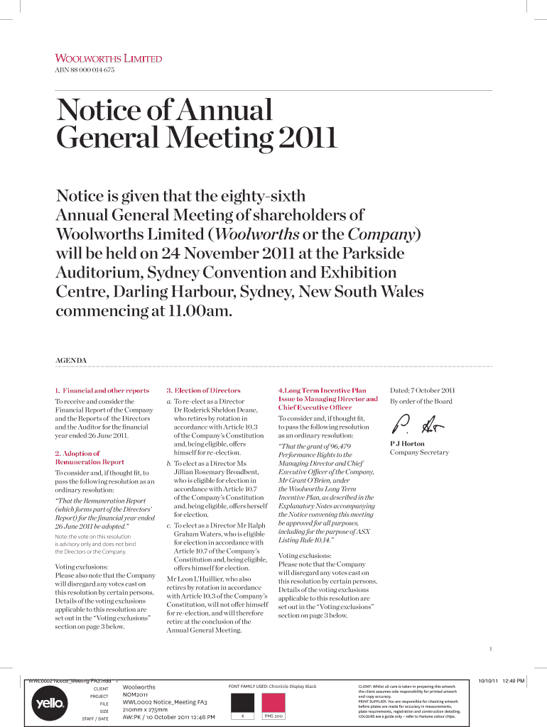 Get the free Notice of Annual General Meeting 2011 - Woolworths Limited