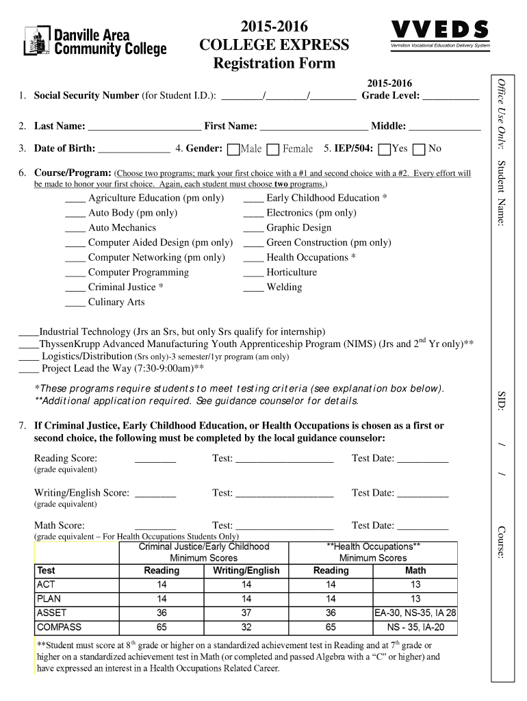 20152016 COLLEGE EXPRESS Registration Form 2. Last Name: First Name: Middle: 3. Date of Birth: 4. Gender: Male Female 5. IEP/504: Yes No be made to honor your first choice. Again, each student must
