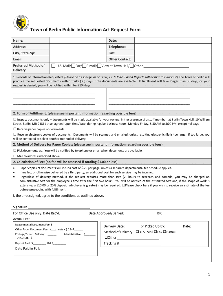 Town of Berlin Public Information Act Request Form Name: Date: Address: Telephone: City, State Zip: Fax: Email: Other Contact: Preferred Method of Delivery U.S. Mail/ Fax/ Email/ View at Town Hall/