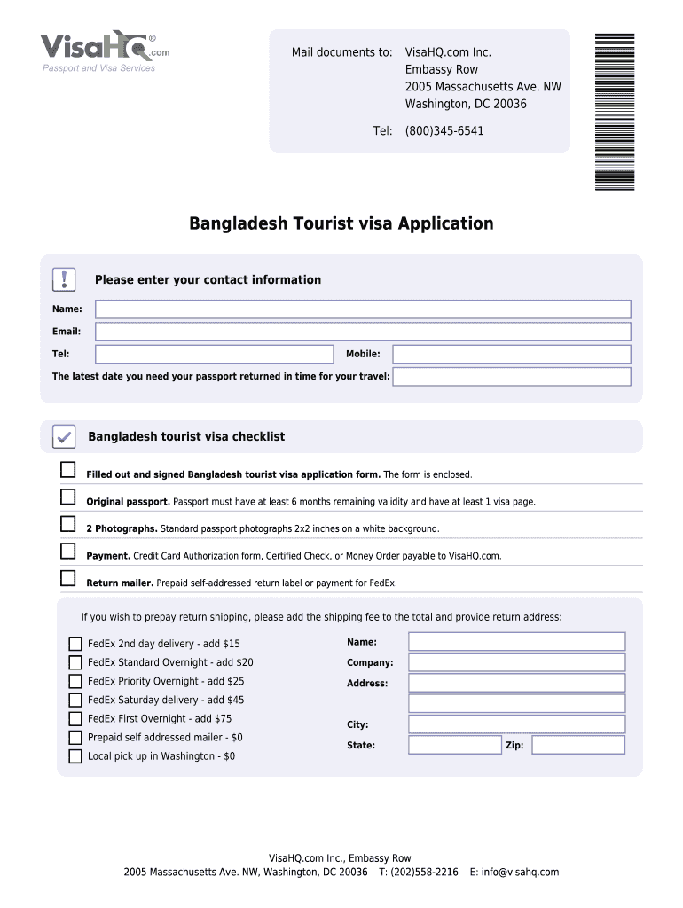 Mail documents to: Tel: VisaHQ.com Inc. Embassy Row 2005 Massachusetts Ave. NW Washington, DC 20036 (800)3456541 Bangladesh Tourist visa Application Please enter your contact information Name: Email: