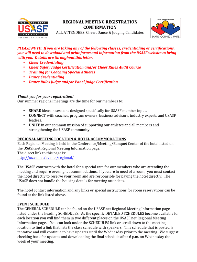 REGIONALMEETINGREGISTRATION CONFIRMATION ATTENDEES:Cheer, Dance&JudgingCandidates PLEASANT:Ifyouaretakinganyofthefollowingclasses, credentialingorcertifications, youwillneedtodownloadandprintformsandinformationfromtheUSASFwebsitetobring