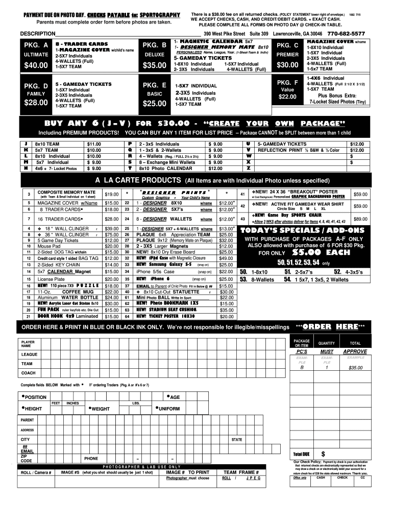 PAYMENT DUE ON PHOTO DAY. CHECKS PAYABLE to SPORTOGRAPHY There is a 38. 00 fee on all returned checks. POLICY STATEMENT lower right of envelope. WE ACCEPT CHECKS CASH AND CREDIT/DEBIT CARDS. EXACT CASH. PLEASE COMPLETE ALL FORMS ON PHOTO DAY CHECK-IN TABLE. Parents must complete order form before photos are taken. 770-682-5577 DESCRIPTION 390 West Pike Street Suite 309 Lawrenceville GA 30046 PKG. A ULTIMATE 40. PAYMENT DUE ON PHOTO DAY. CHECKS PAYABLE to SPORTOGRAPHY There is a 38. 00 fee on...