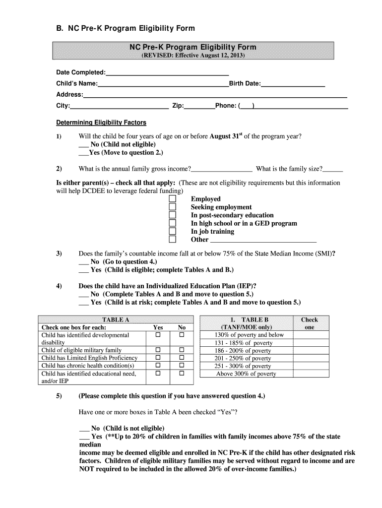 B. NC Prey Program Eligibility Form NC Prey Program Eligibility Form (REVISED: Effective August 12, 2013) Date Completed: Child's Name: Birth Date: Address: City: Zip: Phone: () Determining Eligibility