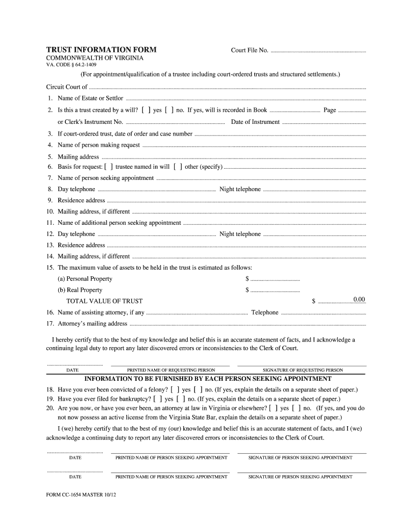 Clear All Data TRUST INFORMATION FORM Court File No. ........................................................................... COMMONWEALTH OF VIRGINIA VA. CODE 64.21409 (For appointment/qualification
