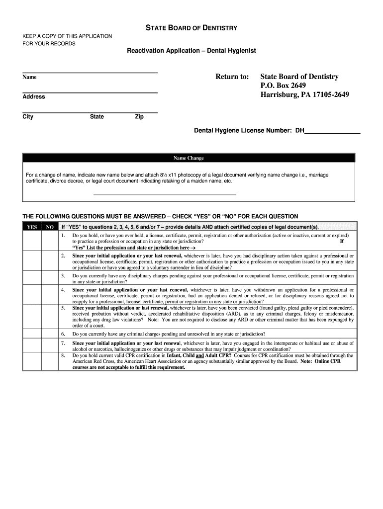 STATE BOARD OF DENTISTRY KEEP A COPY OF THIS APPLICATION FOR YOUR RECORDS Reactivation Application Dental Hygienist Return to: Name Address City State Board of Dentistry P.O. Box 2649 Harrisburg,