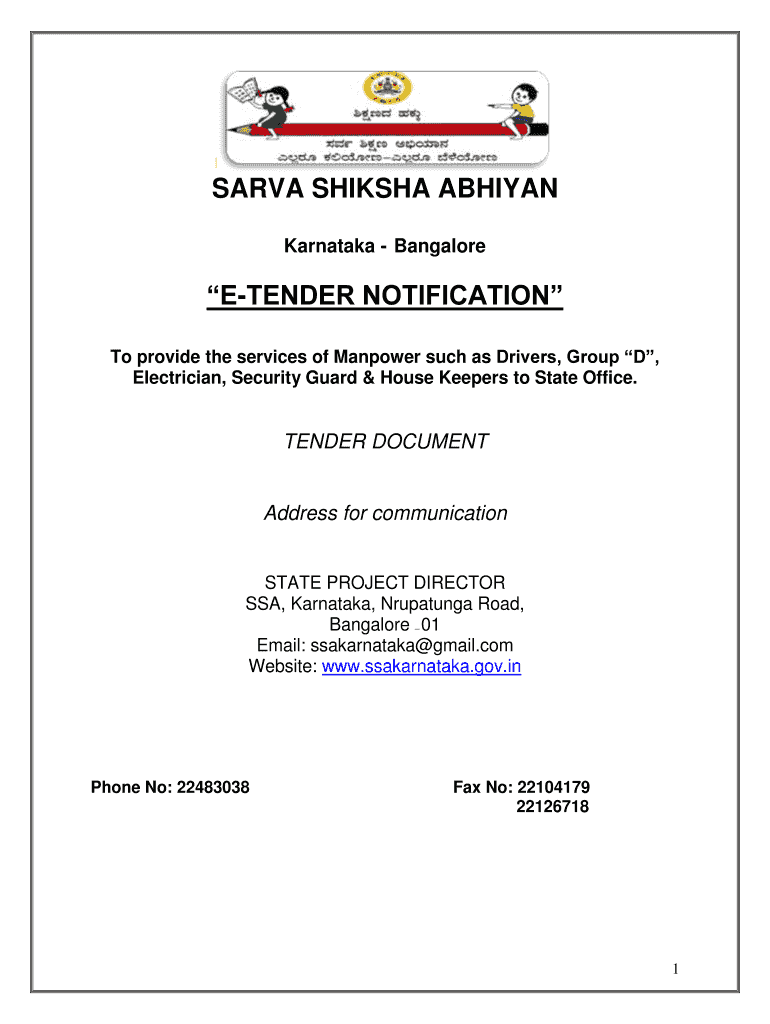 L SARA SHIKHAR ABHINAV Karnataka Bangalore TENDER NOTIFICATION To provide the services of Manpower such as Drivers, Group D, Electrician, Security Guard & housekeepers to State Office. TENDER DOCUMENT