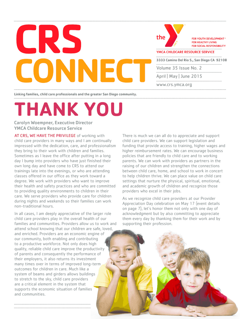 CRS CONNECT YMCA CHILDCARE RESOURCE SERVICE 3333 Camino Del Rio S., San Diego CA 92108 Volume 35 Issue No. 2 April May June 2015 www.crs.ymca.org Linking families, child care professionals and the