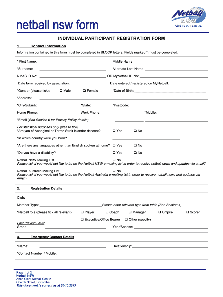 The Individual Participant Registration Form is crucial for registering individuals to engage in netball activities across New South Wales. This form collects essential personal information, requiring details such as the participant's name, date of birth, and emergency contact information. Regular updates are necessary to ensure information remains current, as the form itself is dated as of October 30, 2013. The importance of this form lies in its role in facilitating organized participation in the sport.