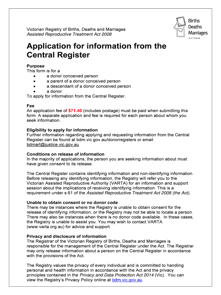 Victorian Registry of Births, Deaths and Marriages Assisted Reproductive Treatment Act 2008 Application for information from the Central Register Purpose This form is for a donor conceived person