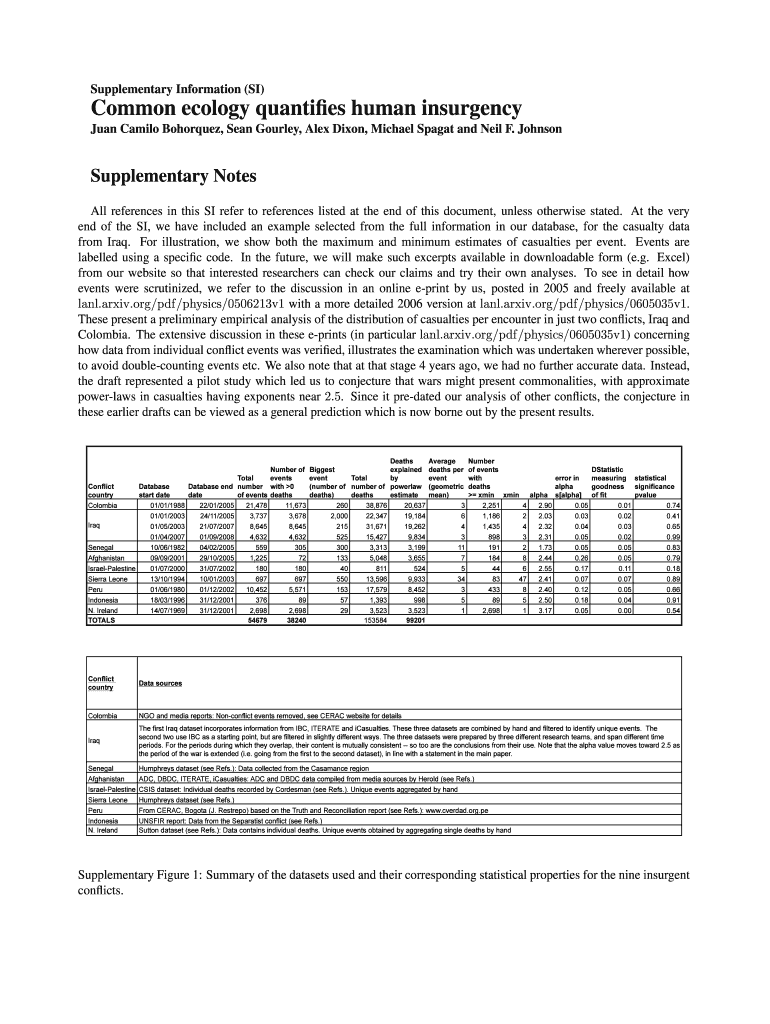 Supplementary Information (SI) Common ecology quantifies human insurgency Juan Camilo Bohorquez, Sean Gourley, Alex Dixon, Michael Pagan and Neil F. Johnson Supplementary Notes All references in this