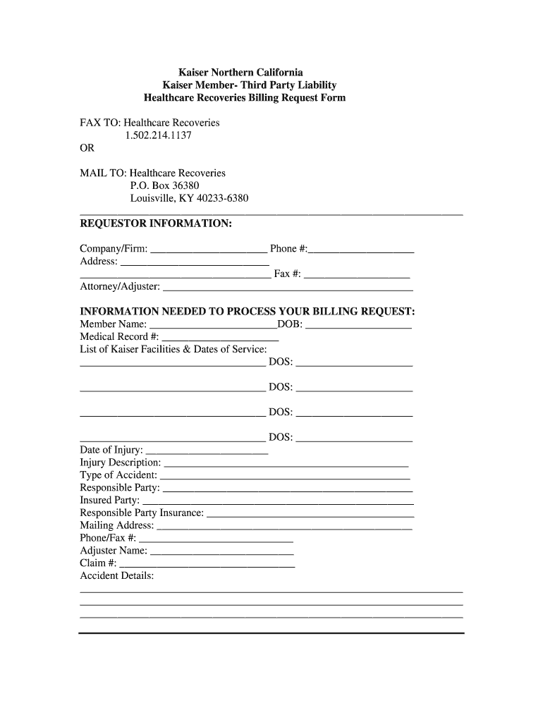 Kaiser Northern California. Kaiser Member Third Party Liability. Healthcare Recoveries Billing Request Form. FAX TO: Healthcare Recoveries. 1.502. 214.1137.