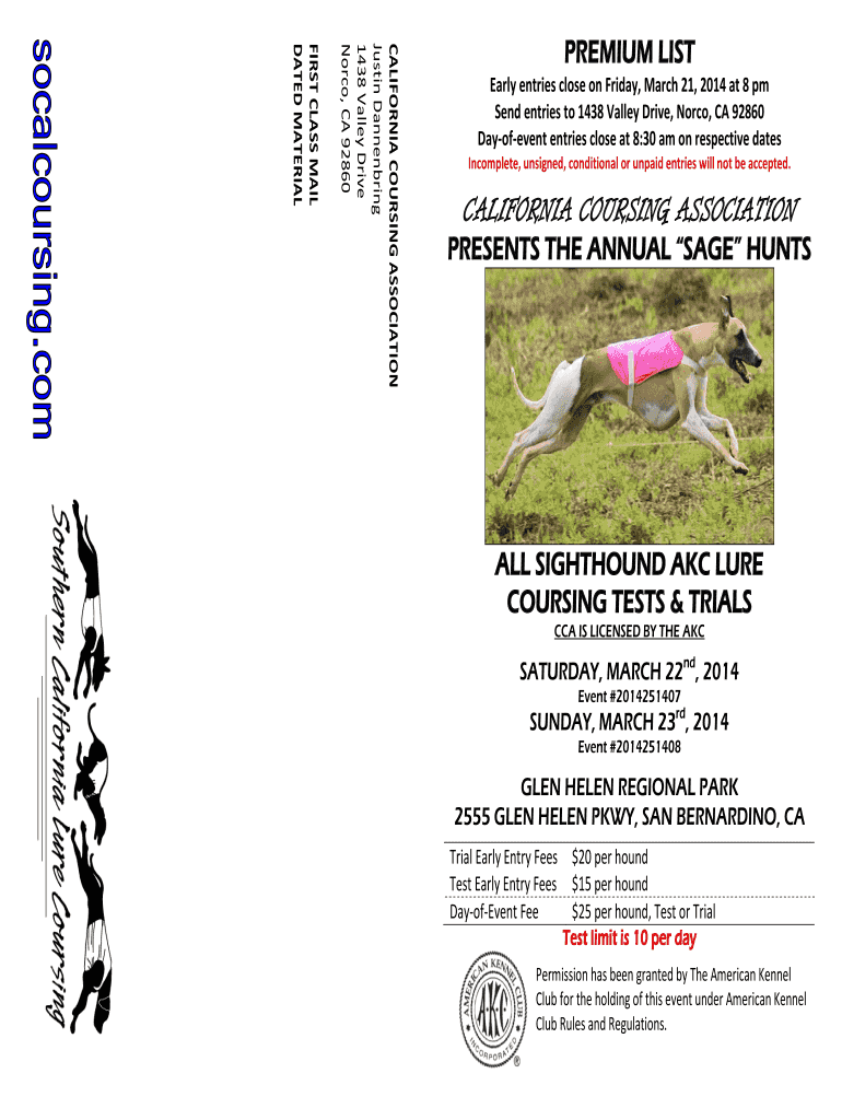 CALIFORNIA COURSING ASSOCIATION Justin Dinnering 1438 Valley Drive Nor co, CA 92860 FIRST CLASS MAIL DATED MATERIAL PREMIUM LIST Early entries close on Friday, March 21, 2014, at 8 pm Send entries