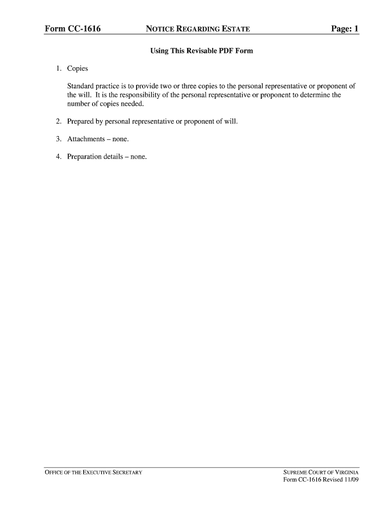 Form CC1616 NOTICE REGARDING ESTATE Page: 1 Using This Revivable PDF Form 1. Copies Standard practice is to provide two or three copies to the personal representative or proponent of the will. It