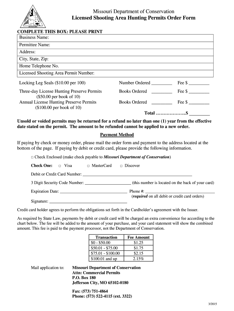 Missouri Department of Conservation Licensed Shooting Area Hunting Permits Order Form COMPLETE THIS BOX: PLEASE PRINT Business Name: Permitted Name: Address: City, State, Zip: Home Telephone No. Licensed