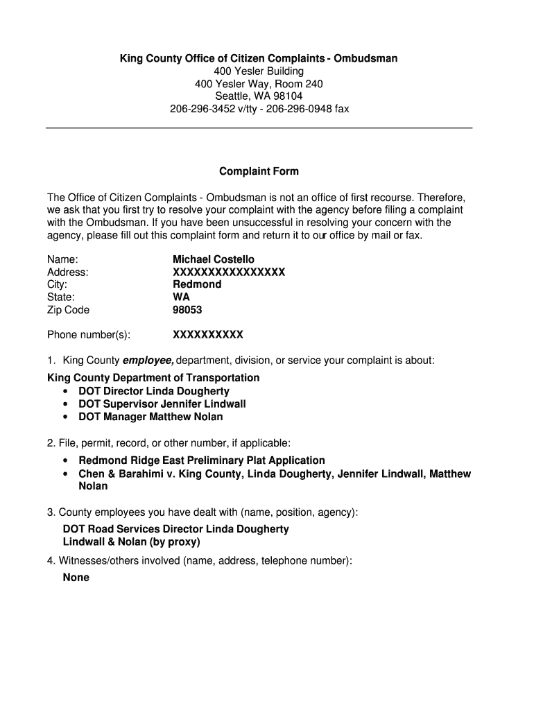 Get the free King County Complaint Form