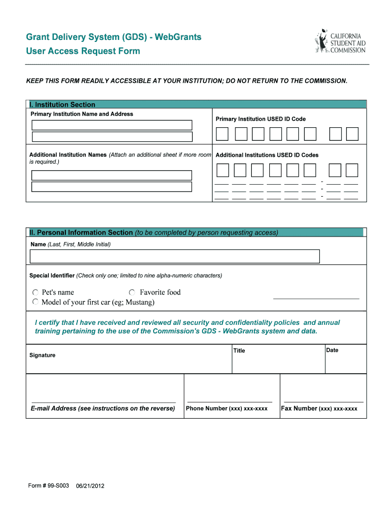 The Grant Delivery System User Access Request Form is a document used by institutions and individuals to request access to the Commission's GDS - WebGrants system.