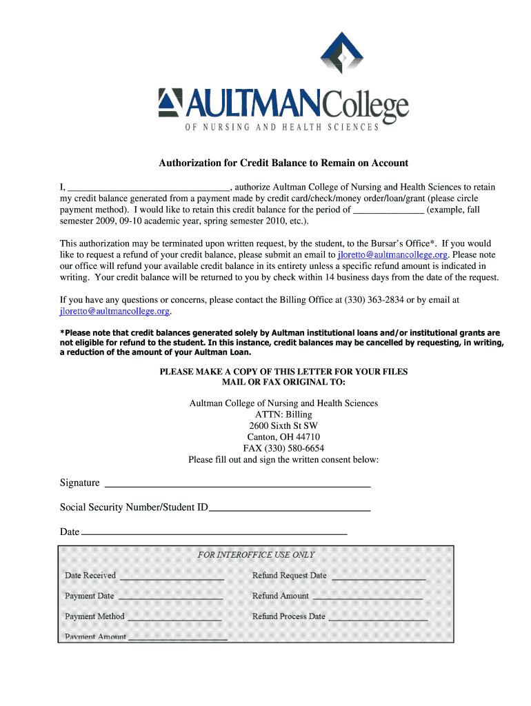 Get the free Authorization to Retain Credit Balance Form - aultmancollege