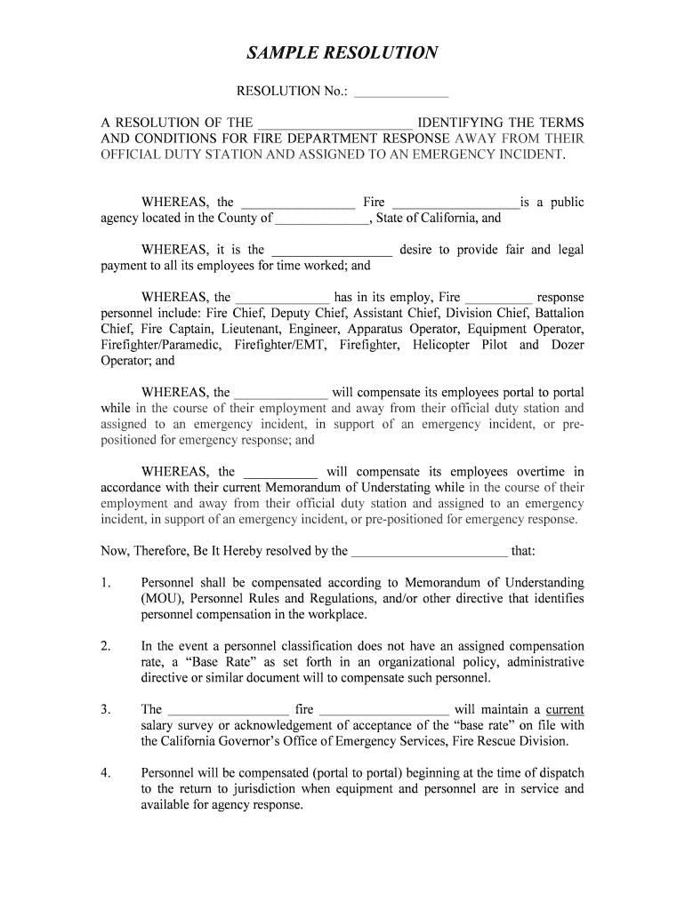 SAMPLE RESOLUTION No.: A RESOLUTION OF THE IDENTIFYING THE TERMS AND CONDITIONS FOR FIRE DEPARTMENT RESPONSE AWAY FROM THEIR OFFICIAL DUTY STATION AND ASSIGNED TO AN EMERGENCY INCIDENT. WHEREAS, the