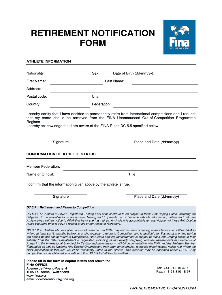 RETIREMENT NOTIFICATION FORM ATHLETE INFORMATION Nationality: Sex: First Name: Date of Birth (dd/mm/by): Last Name: Address: Postal code: City: Country: Federation: I hereby certify that I have decided